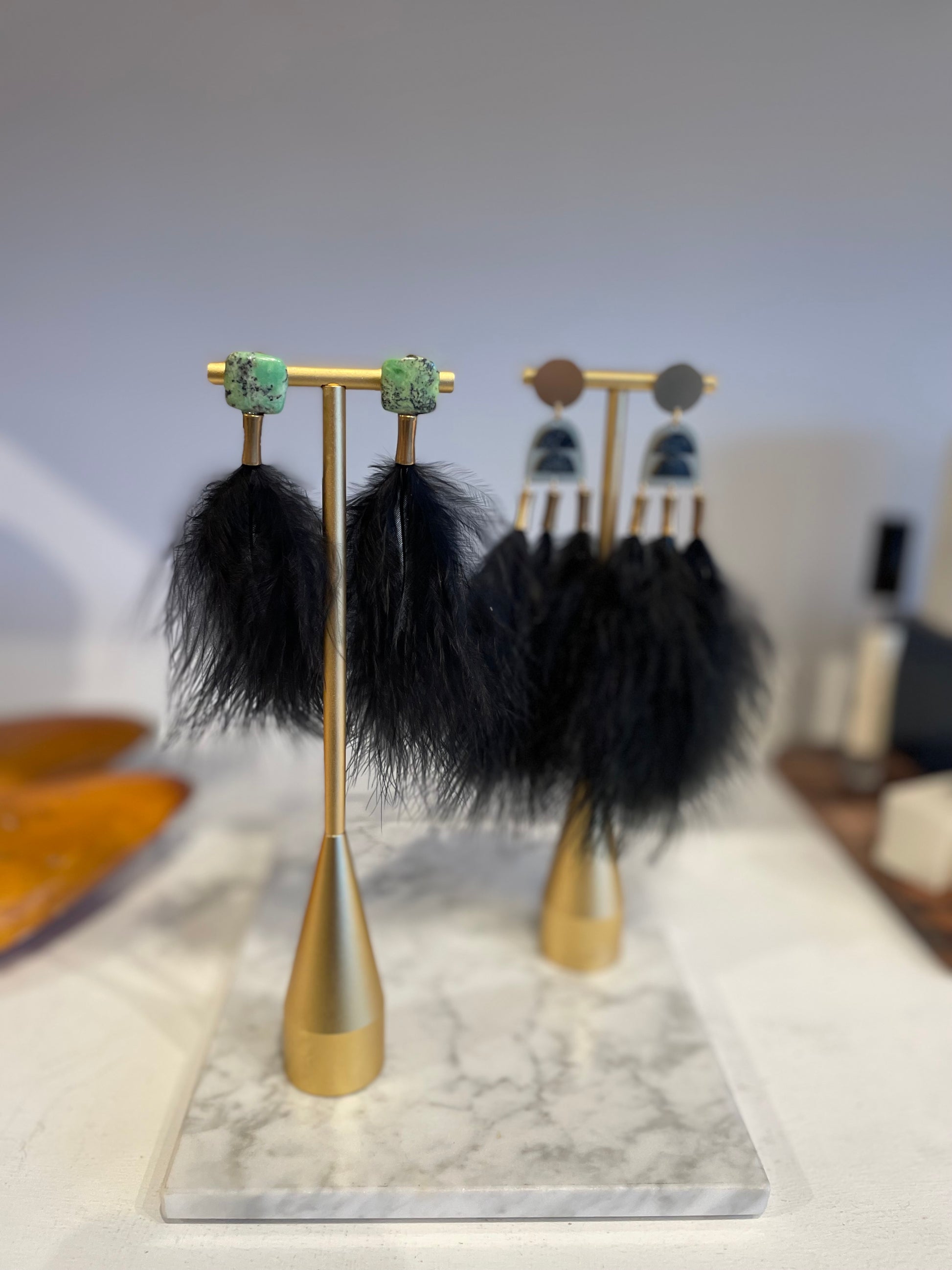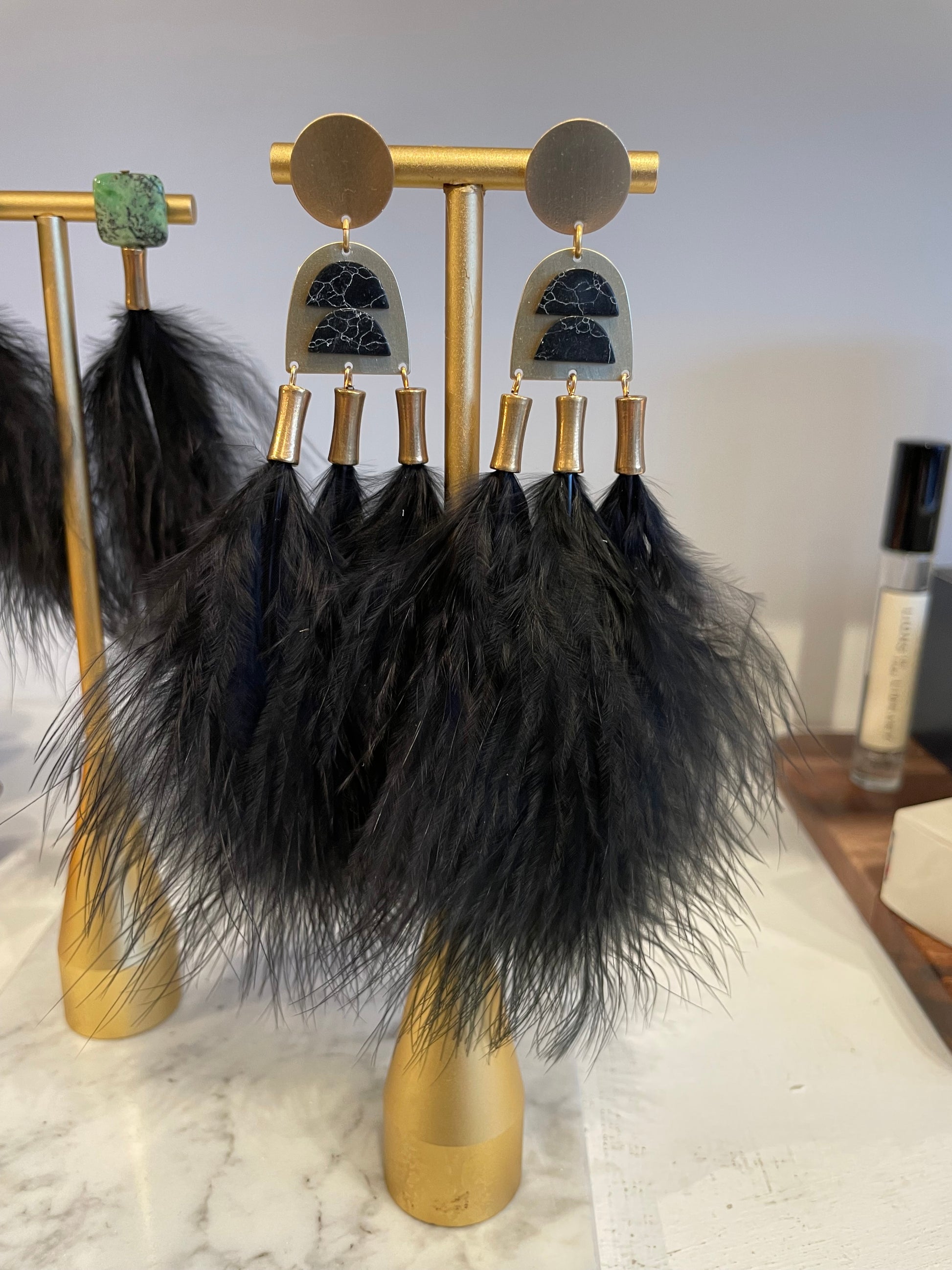 These original beauties are ready for a night out! Black feather earrings with brass and howlite. 5-6 inches long.