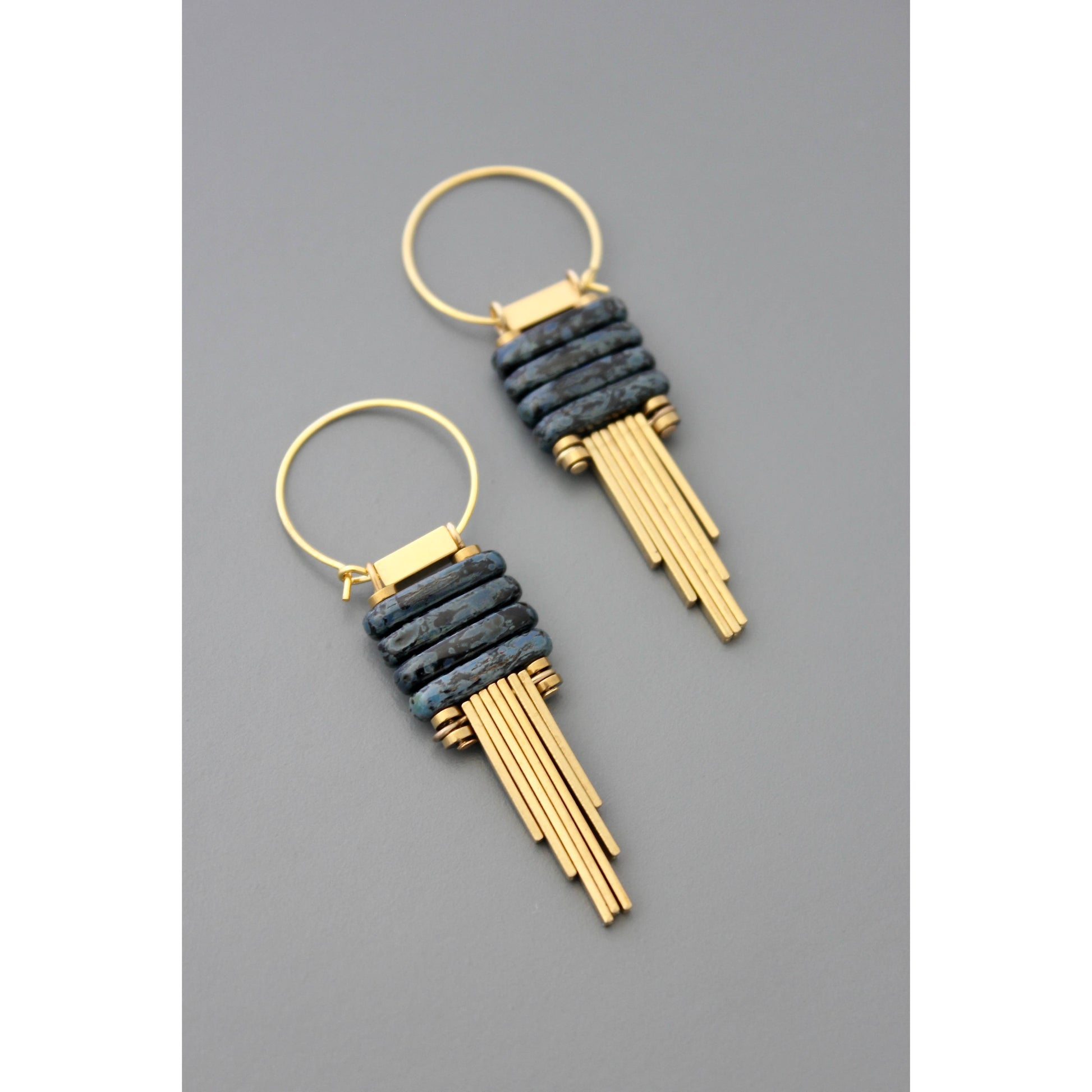 Gold plated brass hoops with czech glass and brass drops. Each earring weighs .185 oz. and measures 2.375 inches long. Each piece is unique so stones and glass may vary in shape, size, and color. Stone inclusions may be visible to the eye and are considered a part of their beauty. Please allow 2-5 weeks for production. Our jewelry consists of plated metal, which may darken or tarnish over time with normal wear. Gently wipe the metal surface with a soft cloth to clean, however, excessive polishing may rub off or scratch the plating. Avoid direct contact with lotions, perfumes, or oils. Excessive light, heat, or moisture will deteriorate the quality of glass, plating, and stones. Do not wear jewelry while in a pool, hot tub, or bathing. If treated with care, your jewelry will last for years to come.