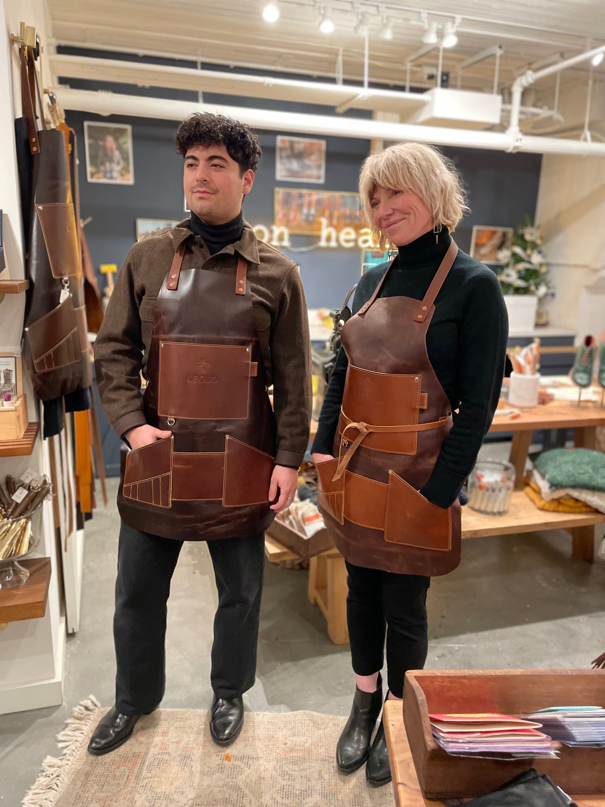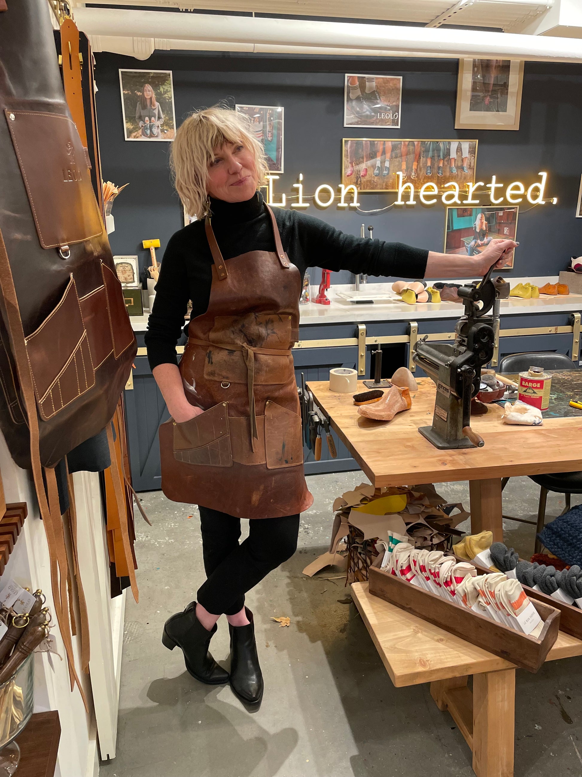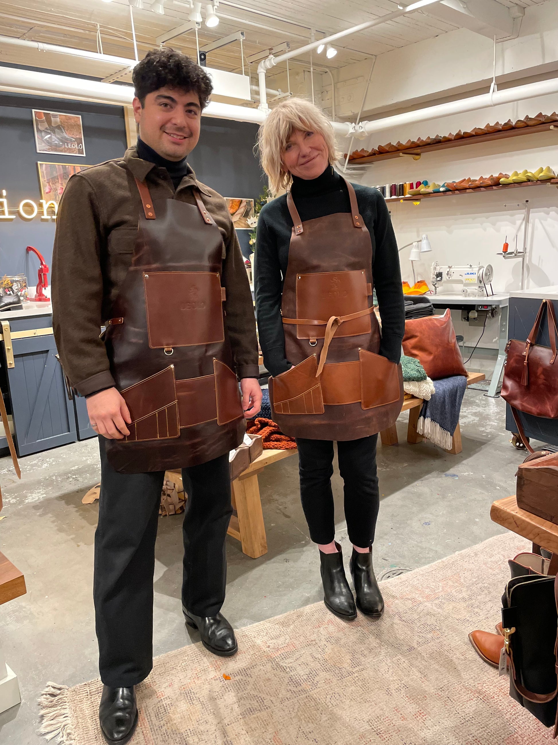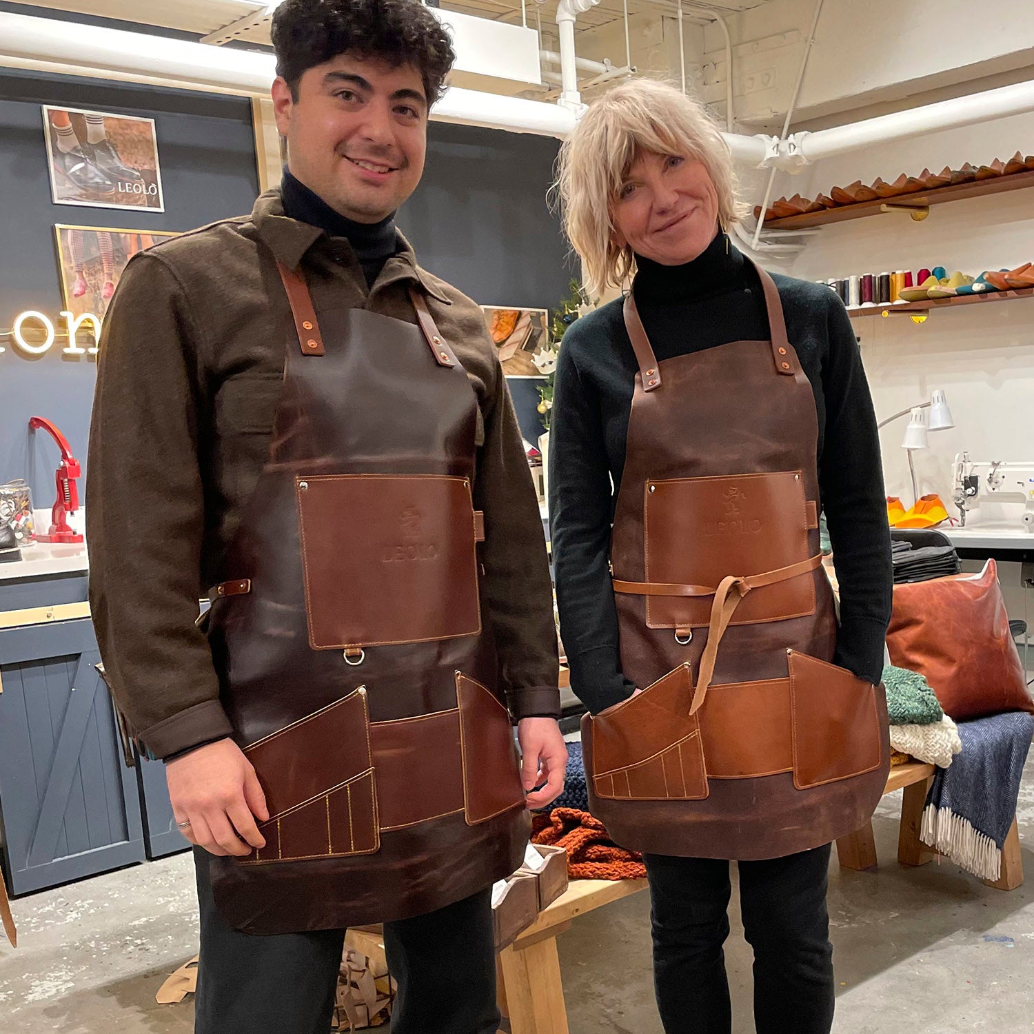Our Leolo leather apron is one-of-a-kind. This is Leanne's beloved Leolo apron, a steadfast tool that never disappoints. This apron has been Leanne's trusted ally in creating each pair of Leolo Handmade Shoes and Boots. It wears beautifully and is remarkably resilient. It's hand-sewn/stitched and made with the finest American leather. The second image is of Leanne's well worn apron.