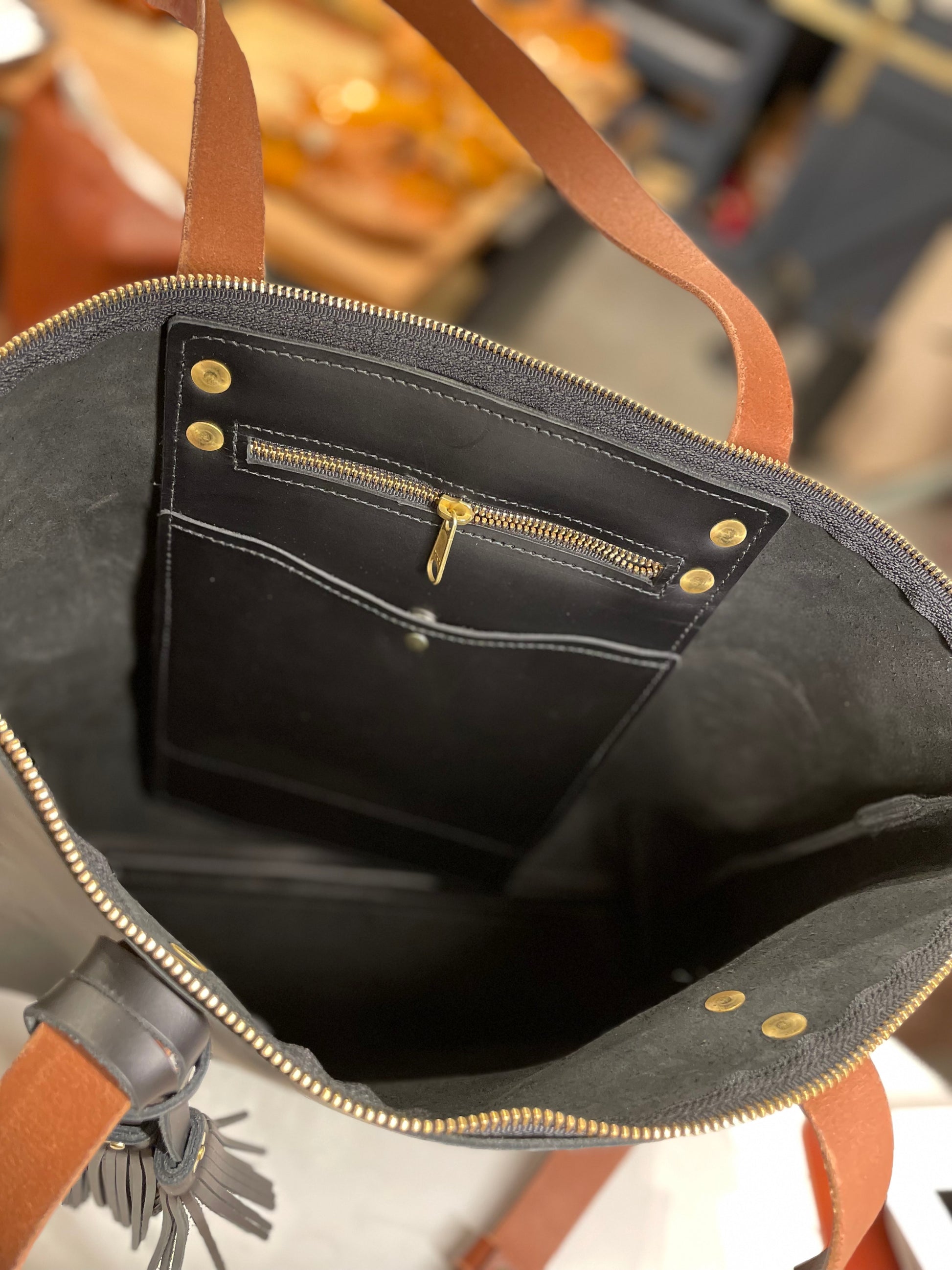 This beauty is designed to be your everyday bag. Handcrafted with the finest full grain leather, premium leather dyes, quality hardware and built to last a lifetime. This zippered tote has ample room for all your goodies. Day or night, travel or errands this tote embodies style, function, beauty and simplicity. This tote holds 15" laptops, has an interior pocket panel with one zippered and one magnetic snap, a sturdy and reinforced base. Approx 15" x 13" x 5".