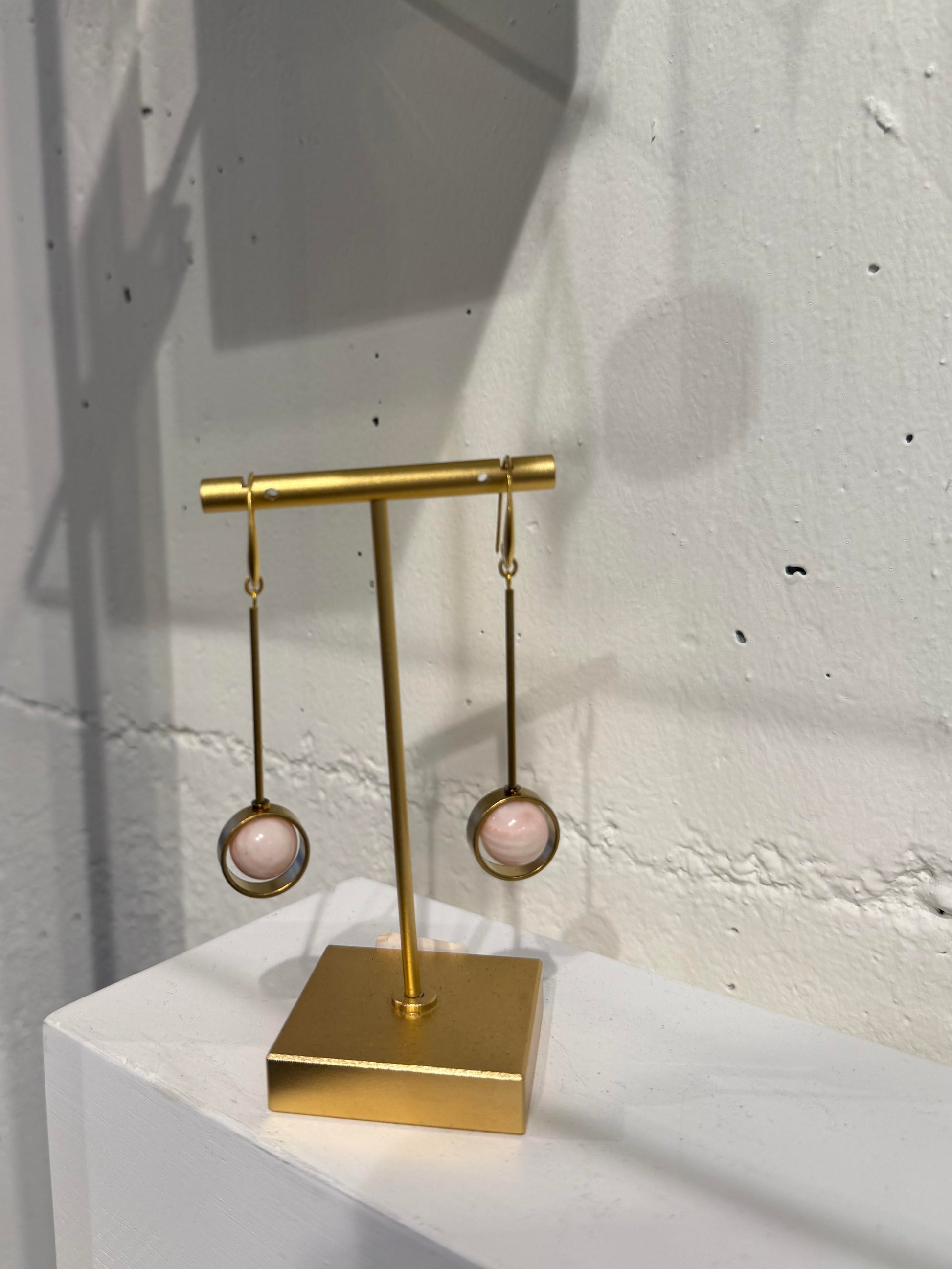 Pink and brass long dangle earrings with pink cylinders inside for a bold and unique look. Elevate your style with these elegant earrings. Made in the US.