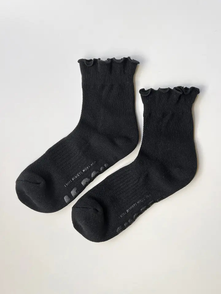 A fun, flirty addition to the Hugger group. Just like the original, this style includes a light silicone grip along the sole for easy, stay-put wear. The crew length and ruffled ankle bring a soft, playful finish—perfect for pairing with flats, clogs, or slides.