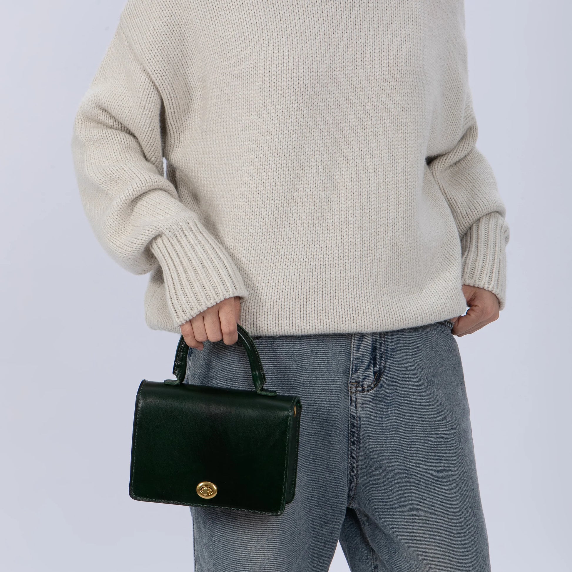 The 'Turn-loc' Mini Satchel features an elegant structured form with a posh leather selection. handcrafted from genuine Italian full-grain leather, offering both durability and a luxurious feel. Its timeless, classic design is enhanced by a striking turn-lock brass closure. The rich texture of the leather ages beautifully. The sleek silhouette makes for the perfect evening bag.